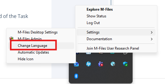 Language can be changed by clicking the M-Files icon in the system tray and selecting Settings > Change Language.