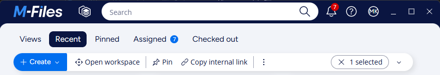 - About M-Files – Available through a menu on the Top bar marked with the user’s initials